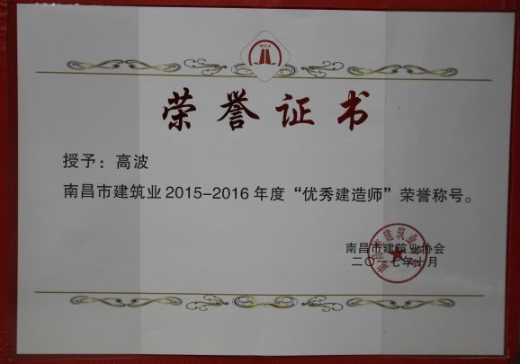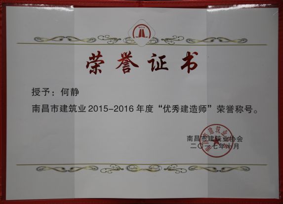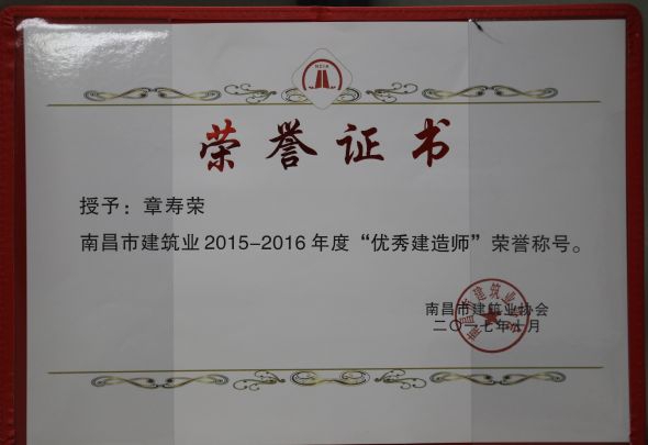 南昌市建筑業(yè)協(xié)會(huì)對(duì)公司頒發(fā)了南昌市建筑業(yè)2015-2016年度“先進(jìn)企業(yè)”榮譽(yù)稱號(hào),對(duì)公司建造師章壽榮、何靜、胡建平、高波頒發(fā)了南昌市建筑業(yè)2015-2016年度“優(yōu)秀建造師”榮譽(yù)稱號(hào);中國(guó)建筑業(yè)協(xié)會(huì)對(duì)章壽榮頒發(fā)了全國(guó)建筑業(yè)企業(yè)優(yōu)秀項(xiàng)目經(jīng)理榮譽(yù)稱號(hào)。