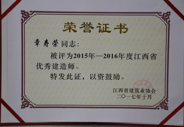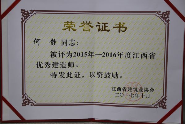 江西省建筑業(yè)協(xié)會對公司頒發(fā)了2015-2016年度江西省建筑業(yè)先進(jìn)企業(yè)榮譽(yù)稱號,對公司建造師何靜、胡建平、高波、章壽榮頒發(fā)了2015-2016年度江西省優(yōu)秀建造師榮譽(yù)稱號。